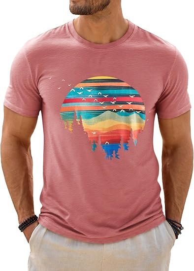 - 【Features】: Mens summer tshirts are feature with short sleeve, round neck, solid color with geometric nature sunset printed, that add a timeless and versatile style to these t-shirts, and loose fit style give you more relaxed and freedom